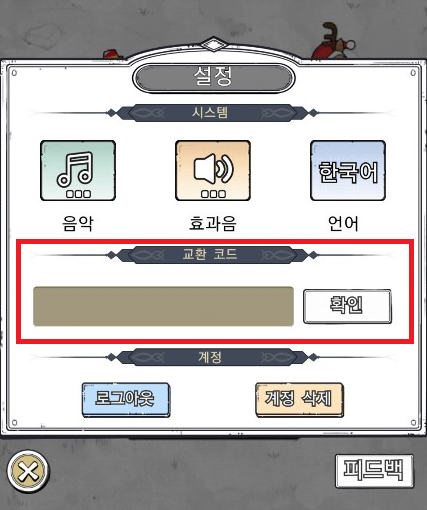 [ 설정 ]을 누르면 팝업 안에 교환 코드 입력란이 있다. 아래에 있는 쿠폰리스트들을 해당 칸에 입력한다면 보상을 받을 수 있다.