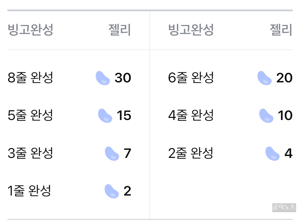 2024년도 초에는 빙고이벤트를 진행 중이다. 빙고 개수에 따라 젤리를 주는 이벤트예요. 빙고 완성 줄 수에 따라 젤리를 지급해 줘요. 1줄 완성 시 2개를 주고 8줄 완성 시에는 최대 30개의 젤리를 준다고 해요.