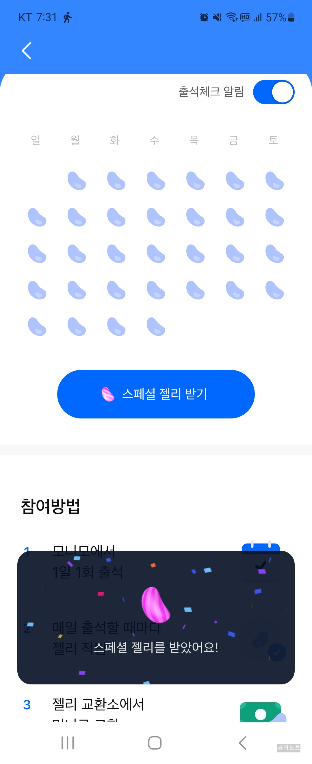 기존에 하루 10~ 30회 송금 시 젤리를 받을 수 있었으나 지금은 최초 송금 시 스페셜젤리 1개 지급하는 이벤트를 진행하고 있어요.