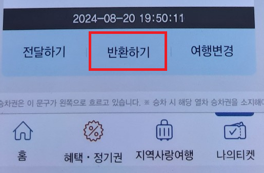 설명처럼 나의 티켓 메뉴에서 환불할 표의 하단에 있는 반환하기를 터치합니다.