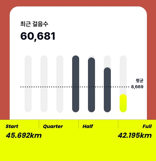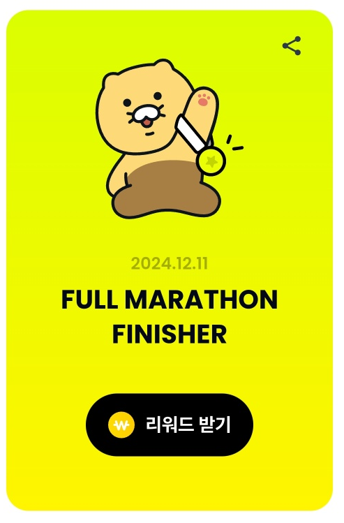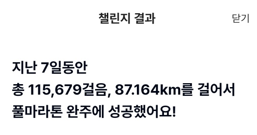 7일 걷기 챌린지의 경우 7일 동안의 걸음 수를 합쳐 마라톤 완주 거리인 42.195km를 걸어야 합니다. 걸음 수로는 5만 6천 걸음으로 저는 3일을 남겨놓은 시점에 이미 완주를 해버렸는데요. 완주 시점에 보상이 바로 제공되지 않고 7일이 끝나는 시점에 목표 달성 여부에 따라 보상 획득 버튼이 활성화됩니다. 7일 기간 종료 전 완주를 했더라도 주의할 점으로는 매일 평균 8천 걸음을 달성해야 한다는 점은 주의해야겠네요. 7일의 도전에 대한 보상은 얼마나 될지 궁금해지는데요.